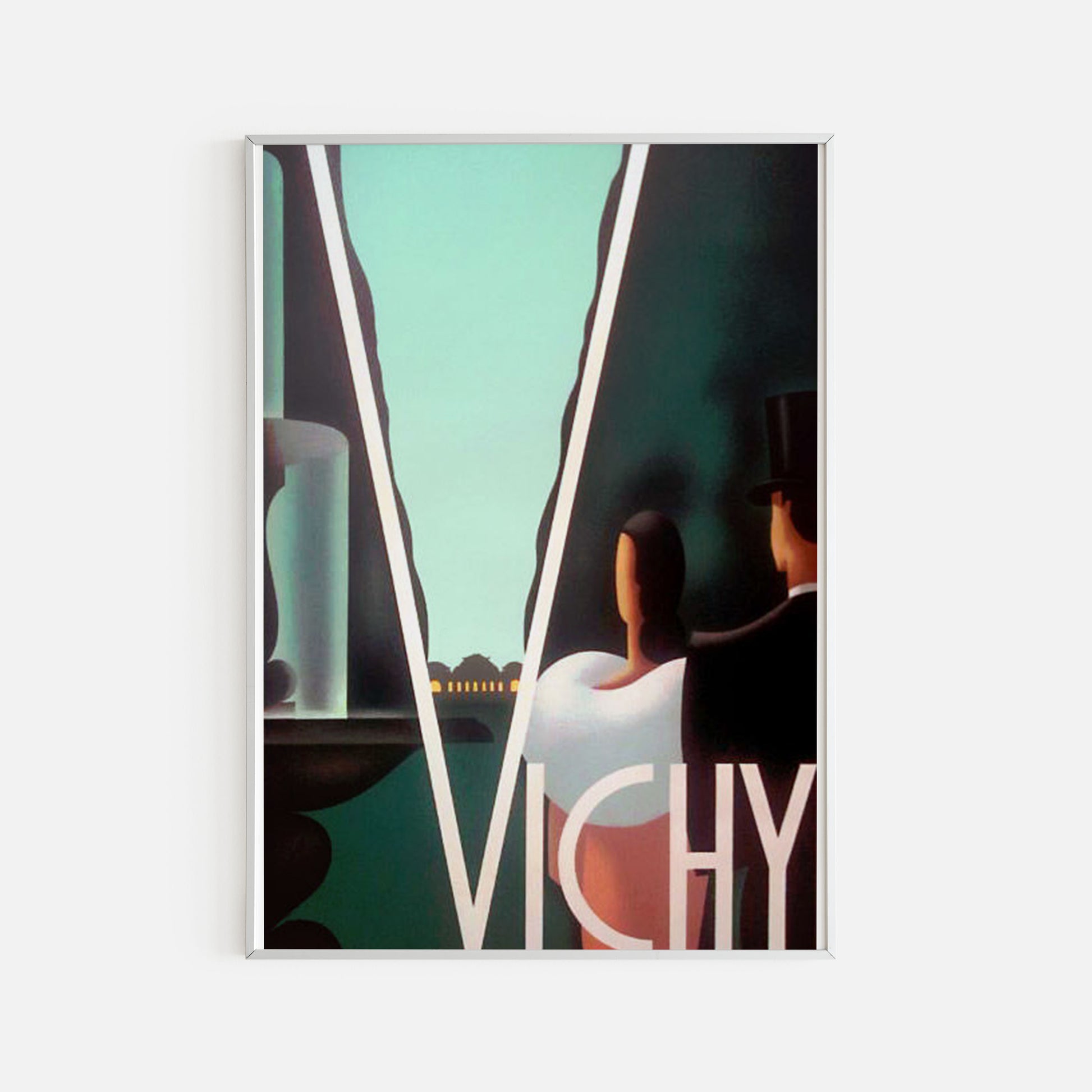 L’affiche iconique Chauffard-PLM. Ce magnifique poster Vichy est l’œuvre de Lucien Chauffard en 1928. L’illustration montre un couple devant une fontaine avec, au loin, un bâtiment. Le trait se rapproche de l’abstrait, notamment pour les personnages qui ne sont qu’esquissés. Cependant, on reconnait la ville au premier coup d’œil : la fontaine, le Grand Casino et un couple fortuné. Nous sommes à Vichy.
